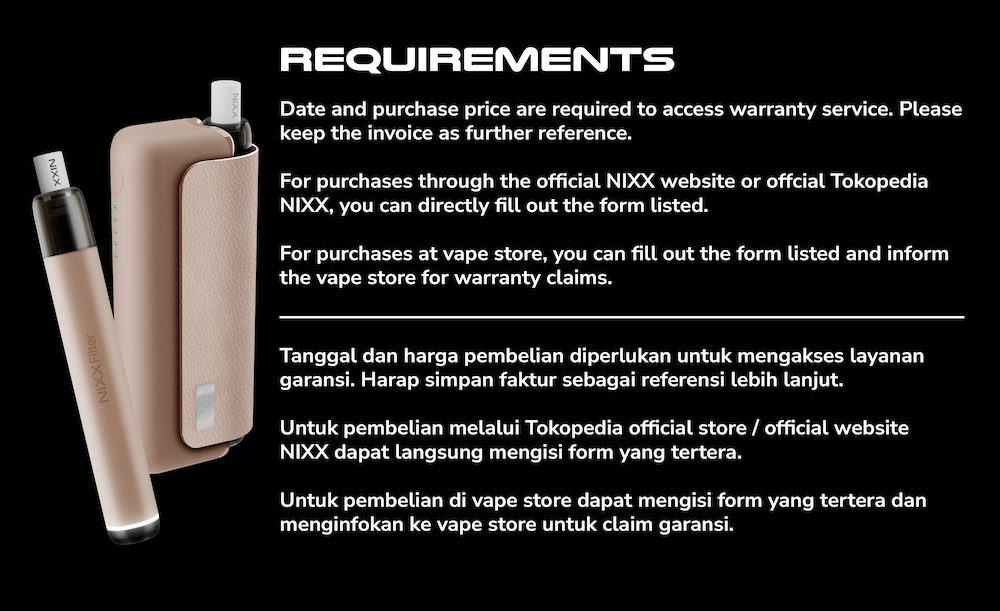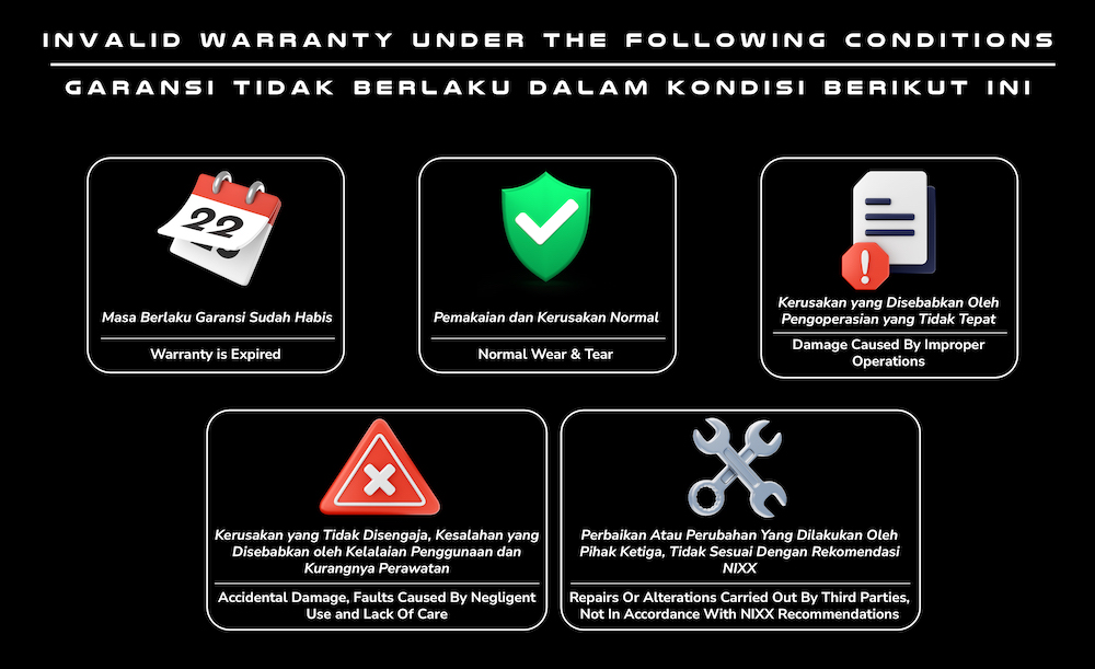 SETELAH MENGISI FORM KLAIM GARANSI, KONSUMEN WAJIB MENGIRIMKAN VIDEO KONFIRMASI KERUSAKAN VIA WHAT’SAPP OFFICIAL NIXX, AGAR DAPAT DIPROSES LEBIH CEPAT.